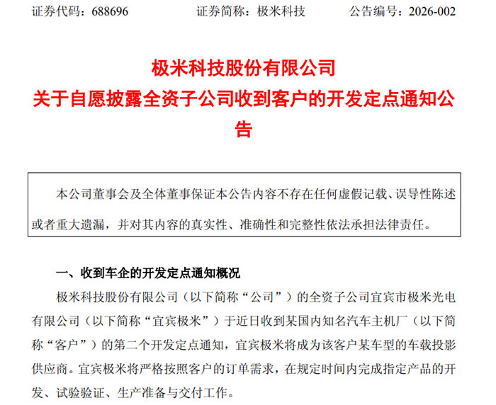 近日,极米科技股份有限公司(证券代码:688696,证券简称:极米科技)发布公告称,其全资子公司宜宾市极米光电有限公司(以下简称 “宜宾极米”)收到某国内知名汽车主机厂的第二个开发定点通知,宜宾极米将正式成为该客户某车型的车载投影供应商。