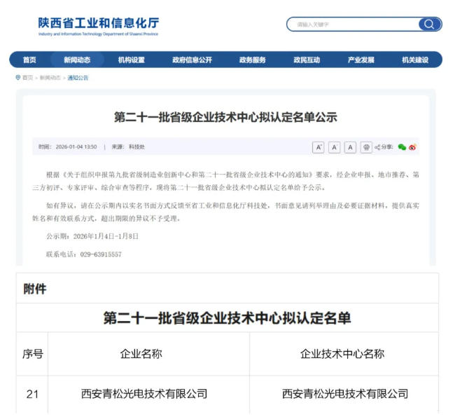 近日,陕西省工业和信息化厅正式公示了第二十一批省级企业技术中心拟认定名单,青松光电凭借突出的技术创新能力和完善的研发体系成功入选。