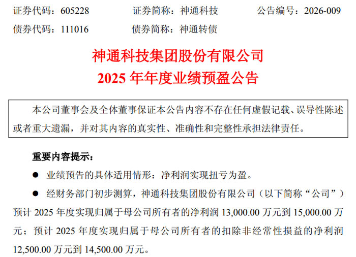 近日,神通科技集团股份有限公司(证券代码:605228,证券简称:神通科技;债券代码:111016,债券简称:神通转债)发布 2025 年年度业绩预盈公告(公告编号:2026-009),公司预计 2025 年度实现扭亏为盈,经营业绩迎来显著改善。