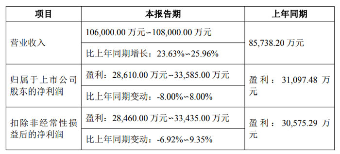 业绩预告期间为 2025 年 1 月 1 日至 2025 年 12 月 31 日。报告期内,公司营业收入预计达到 106,000.00 万元至 108,000.00 万元,较上年同期的 85,738.20 万元增长 23.63% 至 25.96%;归属于上市公司股东的净利润预计盈利 28,610.00 万元至 33,585.00 万元,较上年同期的 31,097.48 万元变动幅度为 - 8.00% 至 8.00%;扣除非经常性损益后的净利润预计盈利 28,460.00 万元至 33,435.00 万元,较上年同期的 30,575.29 万元变动幅度为 - 6.92% 至 9.35%。