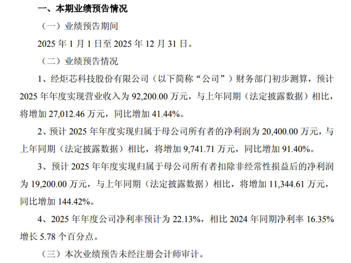 1 月 26 日,炬芯科技股份有限公司(证券代码:688049,证券简称:炬芯科技)发布 2025 年年度业绩预告,公司全年经营成果显著,营业收入、净利润等核心指标均实现大幅增长,盈利规模与质量双向提升。