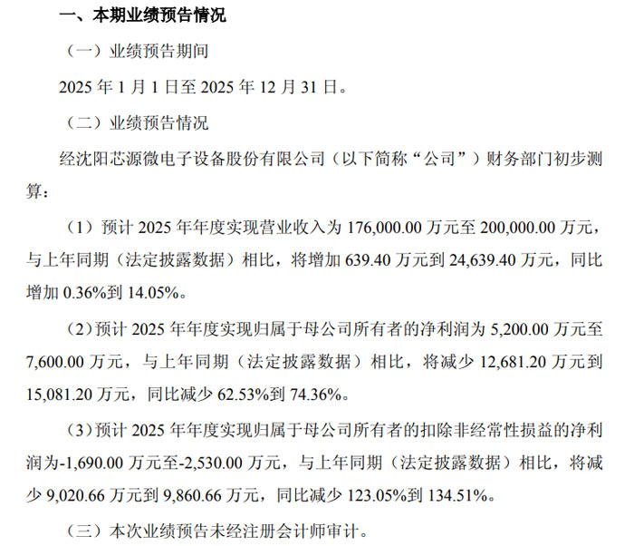 沈阳芯源微电子设备股份有限公司预计2025 年年度实现营业收入 176,000.00 万元至 200,000.00 万元,较上年同期法定披露数据 175,360.60 万元增加 639.40 万元至 24,639.40 万元,同比增长 0.36% 至 14.05%。