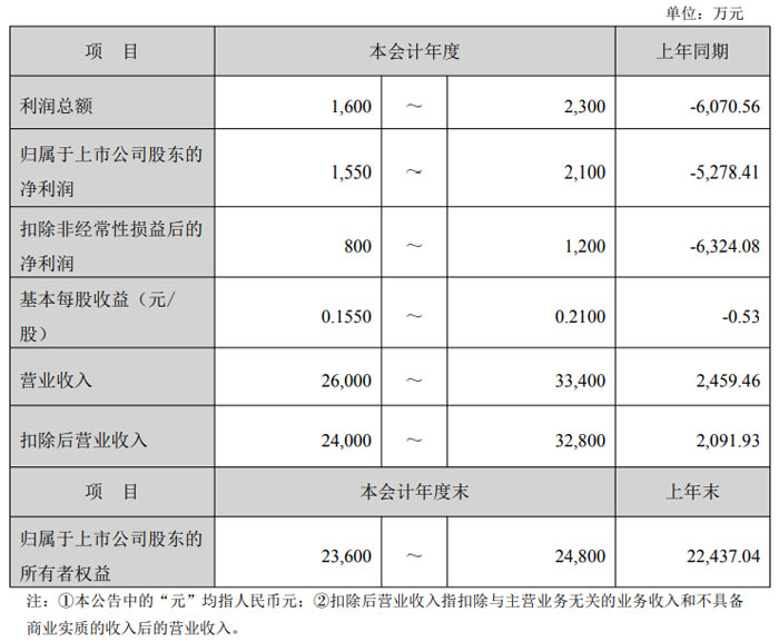 利润总额预计为 1600 万元至 2300 万元,上年同期则为 - 6070.56 万元;归母净利润预计在 1550 万元至 2100 万元之间,较上年同期的 - 5278.41 万元实现扭亏为盈;扣非净利润预计为 800 万元至 1200 万元,上年同期为 - 6324.08 万元。