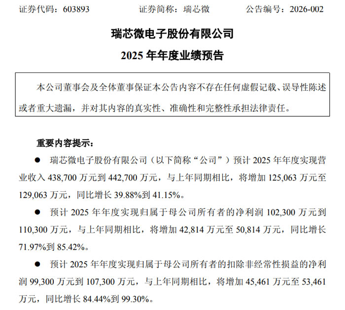 瑞芯微预计实现营业收入 438,700 万元至 442,700 万元,较上年同期的 313,637 万元增加 125,063 万元至 129,063 万元,同比增长 39.88% 至 41.15%。