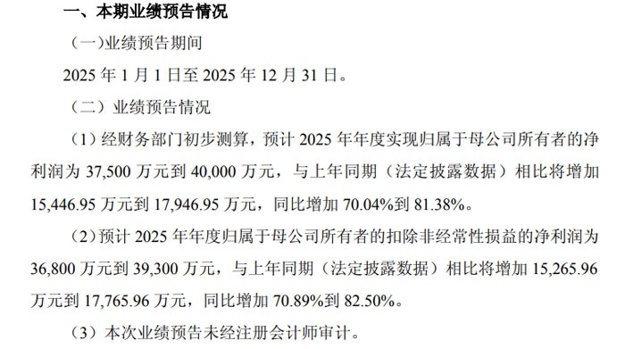 扣非净利润为 36,800 万元至 39,300 万元,较上年同期 21,534.04 万元增加 15,265.96 万元至 17,765.96 万元,同比增长 70.89% 至 82.50%。值得注意的是,本次业绩预告尚未经注册会计师审计。