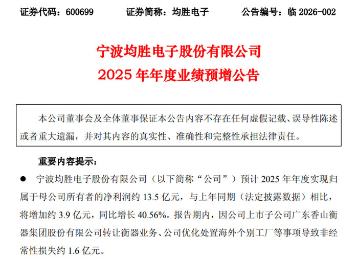 宁波均胜电子股份有限公司2025 年年度业绩预增公告显示,公司预计 2025 年经营业绩实现显著增长,各项核心财务指标表现亮眼。预计 2025 年年度实现归母净利润约 13.5 亿元,相较于上年同期法定披露的 9.60 亿元,增加约 3.9 亿元,同比增长约 40.56%。扣非净利润预计达 15 亿元,较上年同期的 12.82 亿元增加约 2.18 亿元,同比增长约 17.02%。