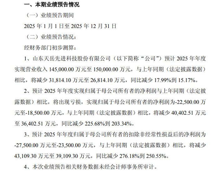 山东天岳先进科技股份有限公司公告显示,公司 2025 年营收同比下滑,归母净利润及扣非净利润均出现亏损,业绩表现较上年同期有所下滑。