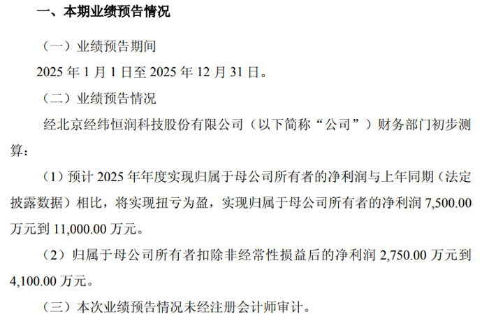 2026 年 1 月 28 日,北京经纬恒润科技股份有限公司(证券代码:688326,证券简称:经纬恒润)发布 2025 年年度业绩预盈公告。经公司财务部门初步测算,2025 年公司将实现扭亏为盈,预计归属于母公司所有者的净利润为 7500.00 万元至 11000.00 万元;归属于母公司所有者扣除非经常性损益后的净利润为 2750.00 万元至 4100.00 万元。需要说明的是,本次业绩预告情况未经注册会计师审计。