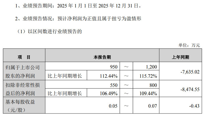 据悉,本次业绩预告期间为 2025 年 1 月 1 日至 2025 年 12 月 31 日。数据显示,公司归属于上市公司股东的净利润预计为 950 万元至 1200 万元,上年同期该指标为 - 7635.02 万元,同比增长 112.44% 至 115.72%;扣除非经常性损益后的净利润预计为 550 万元至 800 万元,上年同期为 - 8474.55 万元,同比增长 106.49% 至 109.44%;基本每股收益预计为 0.05 元 / 股至 0.07 元 / 股,上年同期为 - 0.43 元 / 股。