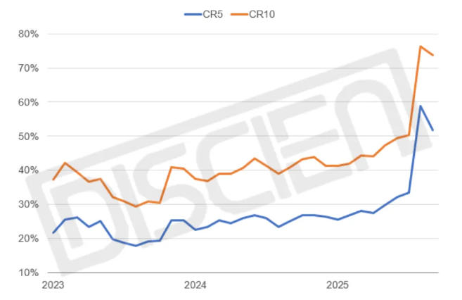 500元以下入门款的销售下滑也让1LCD在2025年的价格带上移表现较为明显,均价从806元增至871元,同时品牌集中度显著提高,CR5由2024年的37%增至2025年的51%。