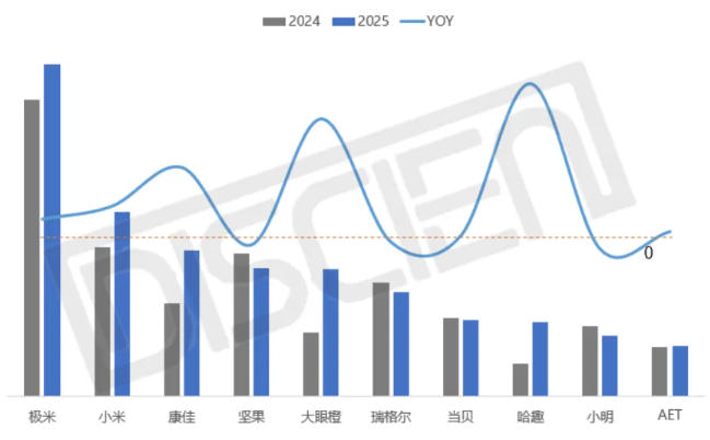 头部品牌中,极米在2025年实现反弹,销量同比增长12%,份额由14.5%提升至17.6%,继续领跑市场,其中主打性价比的Z系列表现亮眼:下半年来Z6X以1500元价位长期位居京东平台销量榜首,10月新品Z9X亦迅速登顶11月京东销量首位。但另一方面,极米的增长仍较大程度受益于去年的低基数,而受大尺寸TV竞品影响较大的DLP产品销量萎缩形式仍较为严峻,坚果,当贝,VIDDA等DLP品牌均迎来不同程度衰退。