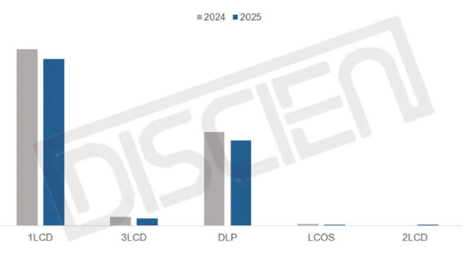 显示技术方面,1LCD仍占据市场主导,2025年销量达348万台,占比64.3%。DLP尽管同时面临市场衰退和大尺寸TV等竞品降价的双重压力,受益于今年以来的价格下沉政策与国补带来的支撑,份额仅微跌至33.9%。3LCD份额继续萎缩,从3.2%跌至2.7%。LCOS仍属小众,份额占比仅0.6%,其商业化进程尚待突破。