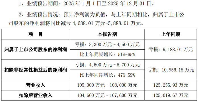 报告期内,归属于上市公司股东的净利润预计亏损 3300 万元–4500 万元,与上年同期亏损 9188.01 万元相比,同比减亏 4688.01 万元 - 5888.01 万元,增幅达 51%-65%;扣除非经常性损益后的净利润:预计亏损 4500 万元–5700 万元,较上年同期亏损 10956.18 万元同比增长 47%-59%;