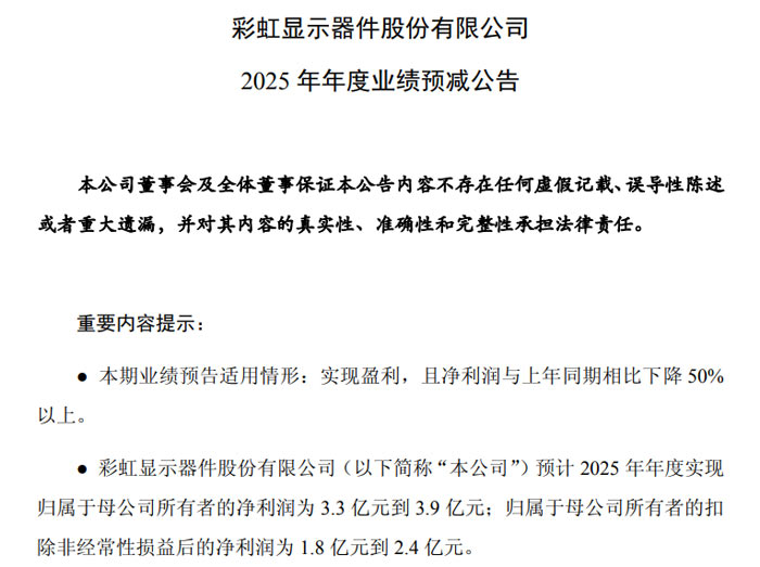 1 月 30 日,彩虹显示器件股份有限公司(证券代码:600707,证券简称:彩虹股份)发布 2025 年年度业绩预减公告。预计公司 2025 年年度实现归属于母公司所有者的净利润为 3.3 亿元至 3.9 亿元,与上年同期相比,将减少 8.5 亿元至 9.1 亿元,同比减少 68.55% 至 73.39%;归属于母公司所有者的扣除非经常性损益后的净利润为 1.8 亿元至 2.4 亿元,较上年同期减少 7.97 亿元至 8.57 亿元,同比降幅达 76.86% 至 82.64%。