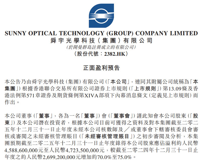 近日,舜宇光学科技 (集团) 有限公司(股份代号:2382.HK,以下简称 “舜宇光学” 或 “集团”)根据香港联合交易所有限公司证券上市规则第 13.09 条及香港法例第 571 章证券及期货条例第 XIVA 部内幕消息条文,发布 2025 年度正面盈利预告。公告显示,集团预计截至 2025 年 12 月 31 日止年度股东应占溢利介于人民币 45.886 亿元至 47.235 亿元之间,较 2024 年同期的人民币 26.992 亿元大幅增长 70.0% 至 75.0%。