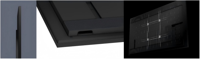 左:纤薄的机身设计;中:底部的内凹式提手;右:位于中心的VESA安装孔