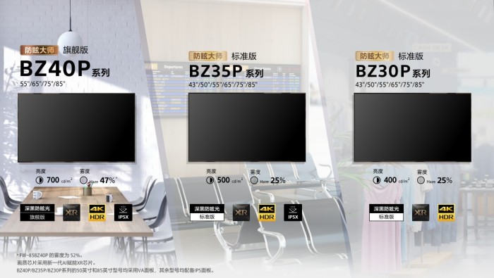 BZ40P系列(旗舰线):共四款产品,尺寸覆盖55英寸到85英寸,配备旗舰版深黑防眩光涂层,可提供47%*1雾度和低反射性能,同时具备700 cd/m²(典型)亮度和IP5X防尘等级。