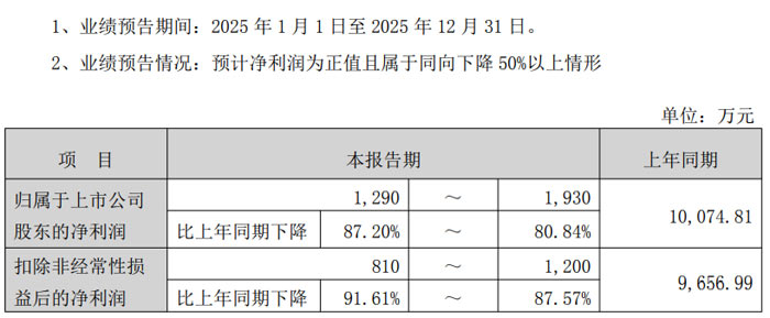 2026 年 1 月 30 日,深圳市汇创达科技股份有限公司(证券代码:300909,证券简称:汇创达)发布 2025 年度业绩预告,公告显示公司本期业绩预计净利润为正值,但同比出现大幅下滑,核心经营数据较上年同期均有明显变动。