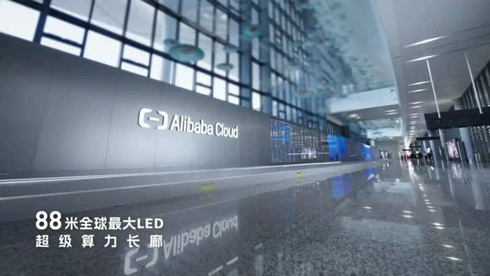 它以整齐排列的巨型服务器阵列为核心,选择以洲明科技全息屏Udesign SV+小间距UMini P为载体。屏幕亮起的瞬间,仿佛打开一扇通往数字世界的窗口,向全球旅客具象化地展示了阿里云全球领先的算力基础设施。
