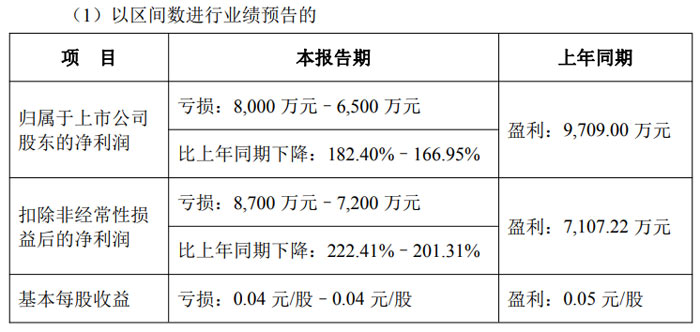 业绩预告期间为 2025 年 1 月 1 日至 2025 年 12 月 31 日。财务数据方面,公司归属于上市公司股东的净利润预计亏损 8000 万元至 6500 万元,上年同期为盈利 9709.00 万元,同比下降 182.40% 至 166.95%;扣除非经常性损益后的净利润预计亏损 8700 万元至 7200 万元,上年同期盈利 7107.22 万元,同比下降 222.41% 至 201.31%;基本每股收益为亏损 0.04 元 / 股,上年同期为盈利 0.05 元 / 股。