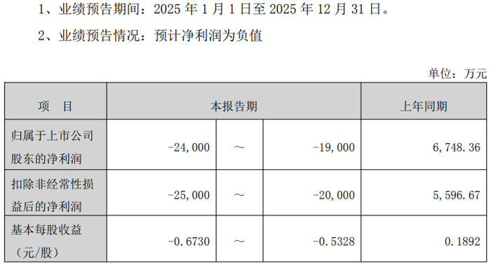 业绩预告数据显示,2025 年 1 月 1 日至 12 月 31 日期间,公司归属于上市公司股东的净利润预计亏损 19,000 万元至 24,000 万元,上年同期该数据为盈利 6,748.36 万元;扣除非经常性损益后的净利润预计亏损 20,000 万元至 25,000 万元,上年同期盈利 5,596.67 万元;基本每股收益预计为 - 0.5328 元 / 股至 - 0.6730 元 / 股,上年同期为 0.1892 元 / 股。