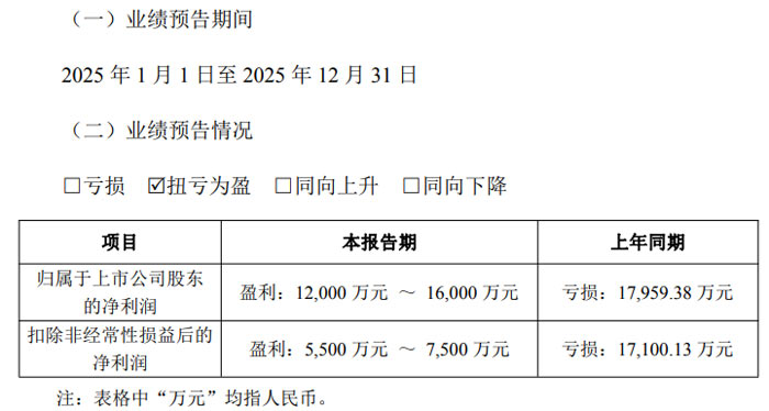公告显示,业绩预告期间为 2025 年 1 月 1 日至 2025 年 12 月 31 日。报告期内,公司归属于上市公司股东的净利润盈利 12,000 万元~16,000 万元,上年同期为亏损 17,959.38 万元;扣除非经常性损益后的净利润盈利 5,500 万元~7,500 万元,上年同期为亏损 17,100.13 万元。