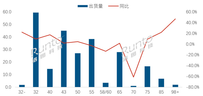 85英寸出货量约670万片,同比大幅增长22.2%,市场份额为2.7%,同比提升0.4个百分点。