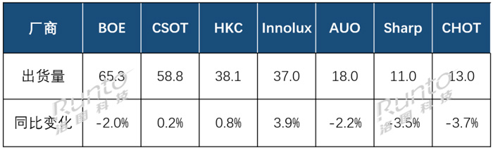 尾部三家厂商CHOT(彩虹光电)、Sharp(夏普)和LGD(乐金显示)的出货量有不同程度的下降。