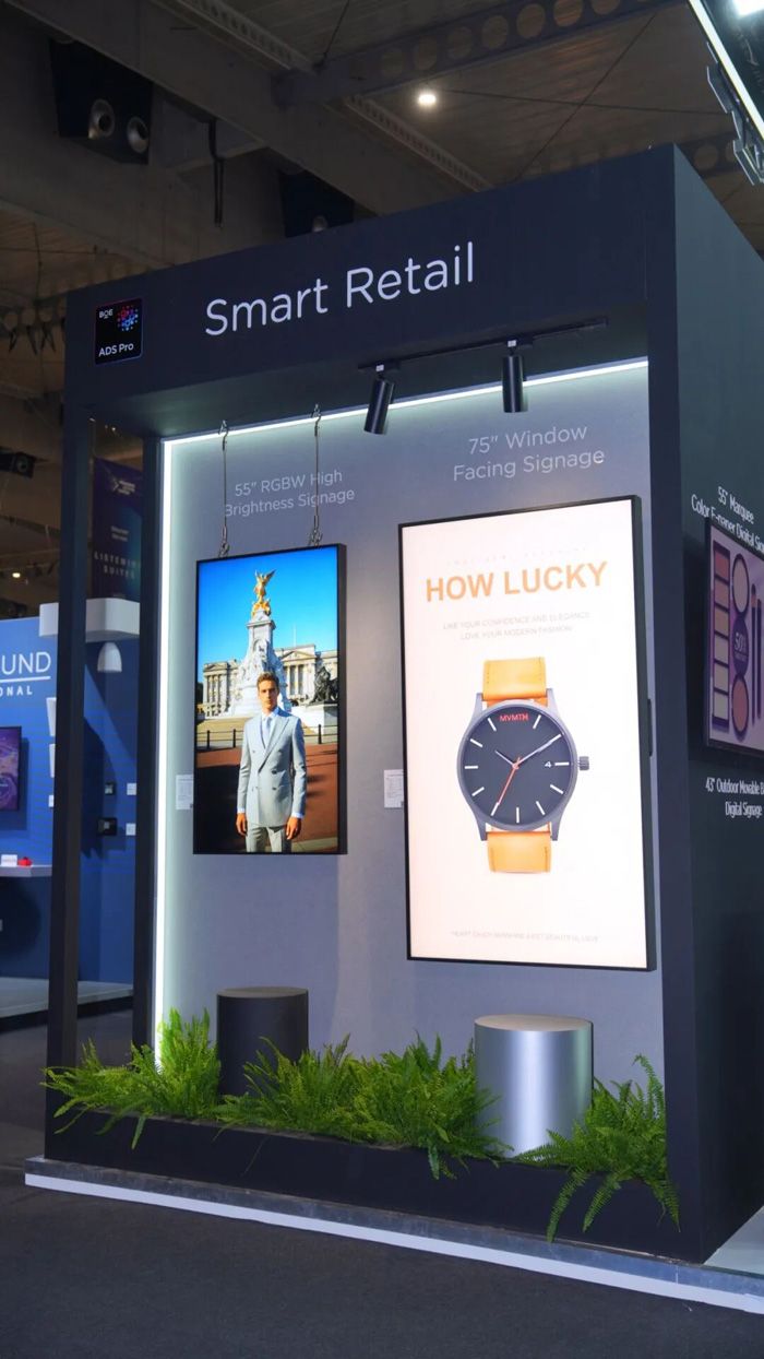 针对高端零售场景,海信商显推出55至85英寸高亮橱窗屏系列,专为旗舰店橱窗打造。4000尼特高亮度确保阳光直射下内容依然清晰,即使顾客佩戴偏光太阳镜,仍可透过橱窗欣赏鲜活逼真的色彩,为奢侈品零售等场景带来革命性体验。