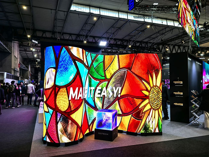 创意显示区由UE系列展架屏与US系列柔性屏组合构成,该方案高度兼容标准化展架系统,强调快速部署、灵活造型与内容便捷更换的能力,精准服务于对布展效率与创意呈现有双重要求的展览展示市场。
