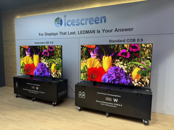 本次展出的108"/136"COB LED一体机采用海信独家 3-in-1 ASIC 架构,结合共阴驱动技术与自研节能算法,在确保卓越画质的同时,功耗较上一代COB产品降低近20%,助力客户实现可持续运营。同时,全球首发54"COB LED标牌产品,同样采用海信自研ASIC架构,大尺寸标准箱体+COB大灯板设计,支持HDMI Daisy Chain, 满足VESA壁挂标准,内置VisionInfo, 可实现无缝拼接,方便客户快速安装,相比传统LED拼接节能30%以上,备受观众瞩目。