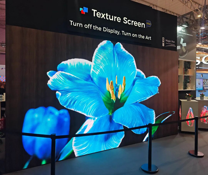 步入洲明展位,第一站即是透明屏/纹理屏展区,U-Natural纹理屏绝对会让你眼前一亮。它打破了屏幕冷冰冰的刻板印象。关机时,它是温润的木纹、质感的石材,完美融入高端建筑装饰;开机时,它瞬间呈现高清绚丽的动态画面。