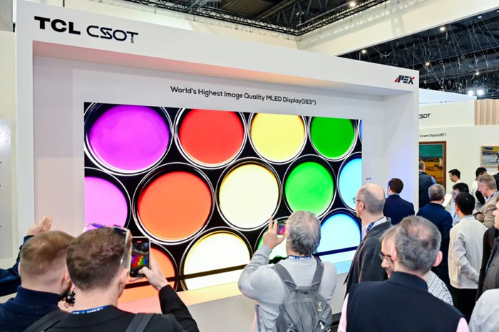另外,京东方展示的COG P0.9 超薄 HDR MicroLED显示屏,3000尼特超高亮度HDR,纤薄机身使每平米减重25%,162英寸巨幕所需拼接模组由288块减至48块,安装效率提升5倍。另一款BYH Ultra P0.9,在10流明环境光下实现20000:1对比度和1500nit全局亮度,135英寸4K COB超薄20毫米一体机屏占比高达99.4%,厚度仅20毫米;TCL展示商用LED显示解决方案——163寸LED一体机,通过超低反封装材料与像素级混合驱动架构,实现高达37500:1的对比度与24bit位深表现。这表明Micro LED在直显与液晶技术的全新竞争格局正在形成。