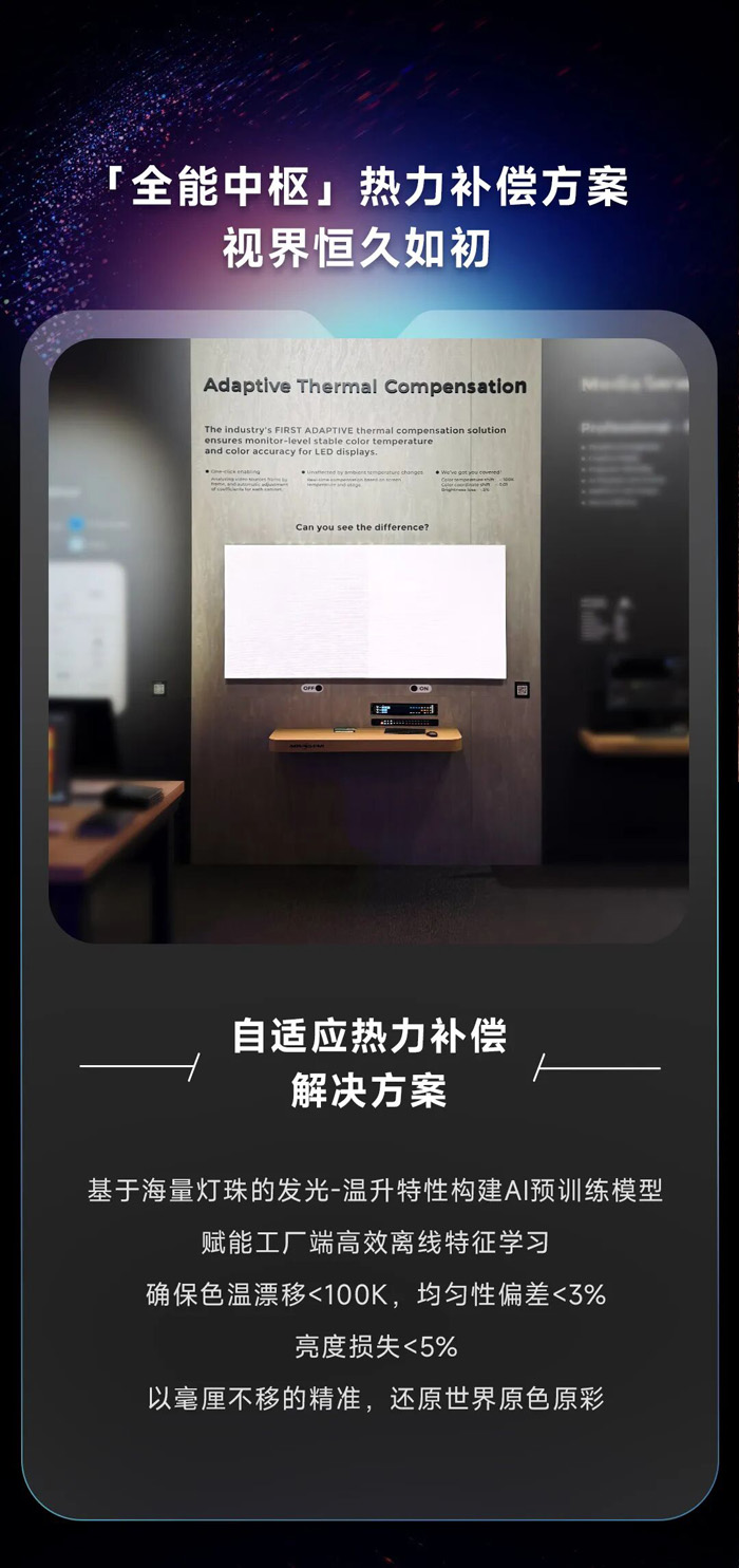 自适应热力补偿解决方案。基于海量灯珠的发光-温升特性构建AI预训练模型赋能工厂端高效离线特征学习,确保色温漂移<100K,均匀性偏差<3%,亮度损失<5%,以毫厘不移的精准,还原世界原色原彩。