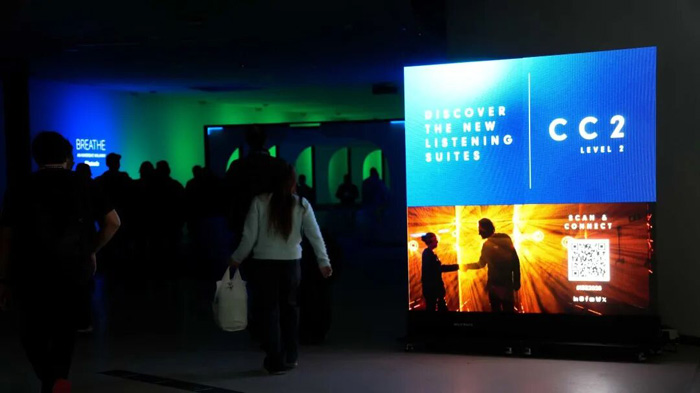 展会现场,20台美矽微LED隐形广告机分布在展馆多个通道节点,不仅承担信息指引功能,更让透明显示自然融入观众的行进路径。美矽微LED隐形广告机采用三边无框设计,左右轻松拼接,支持快速搭建大尺寸透明显示场景。是品牌活动、展览展示、零售终端、商业传媒的最佳移动式透明显示解决方案。