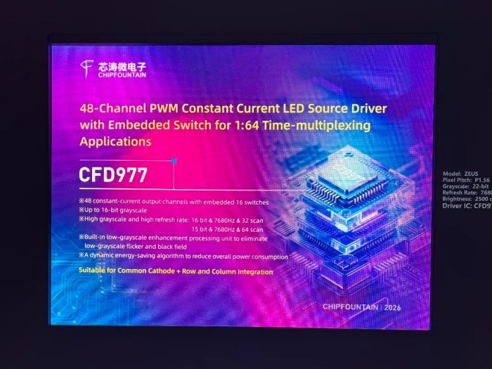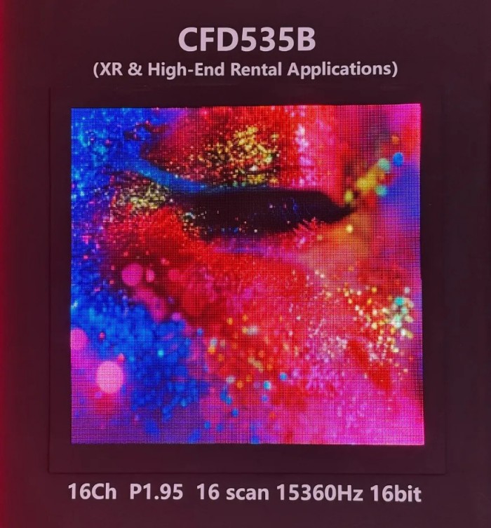 作为芯涛微电子布局高端租赁应用场景的重磅力作,CFD535B能够为最严苛的视觉盛宴提供旗舰级驱动支撑。芯片采用PWM+PAM混合架构,在16扫模式下,轻松实现 15360Hz超高刷新率 与 16bit真实灰度,在高端租赁、固装、XR虚拟拍摄等场景,完美平衡高亮度下的色彩精准与低亮度下的画面稳定,让每一帧细节都无懈可击。