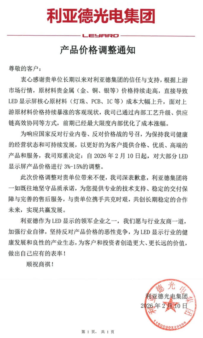 为响应国家反对行业内卷、反对价格战的号召,为保持我司健康的经营状态和可持续发展,以更好的为客户提供合格、优质、高端的产品和服务,我司郑重决定:自2026年2月10日起,对大部分LED显示屏产品价格进行3%-15%的调整。