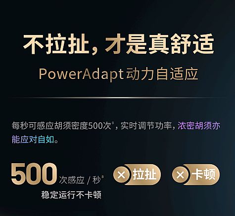 (2)智能系统:SkinIQPro五重模式覆盖敏感肌、粗硬胡须及多元场景。PowerAdapt技术每秒500次感应胡须密度实时调功率,双重引导光环每秒3000次监测压力,三色反馈力度、二色引导路径,提升剃净精准度。
