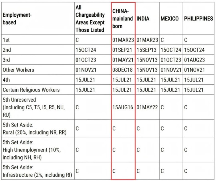 附上完整的排期变化表~注意以下的排期变化表只针对中国大陆出生的申请人,不包括其他国家或者地区(包括港澳台)的申请人。