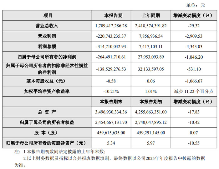 归属于母公司所有者的净利润为 - 264,491,710.61 元,较上年同期 27,953,093.89 元同比下滑 1046.20%;归属于母公司所有者的扣除非经常性损益的净利润为 - 138,529,276.53 元,同比上年同期 32,133,597.05 元下降 531.10%。盈利指标的下滑也反映在每股收益上,公司 2025 年基本每股收益为 - 0.58 元,较上年同期 0.06 元下滑 1066.67%;加权平均净资产收益率为 - 10.21%,较上年同期 1.01% 减少 11.22 个百分点。