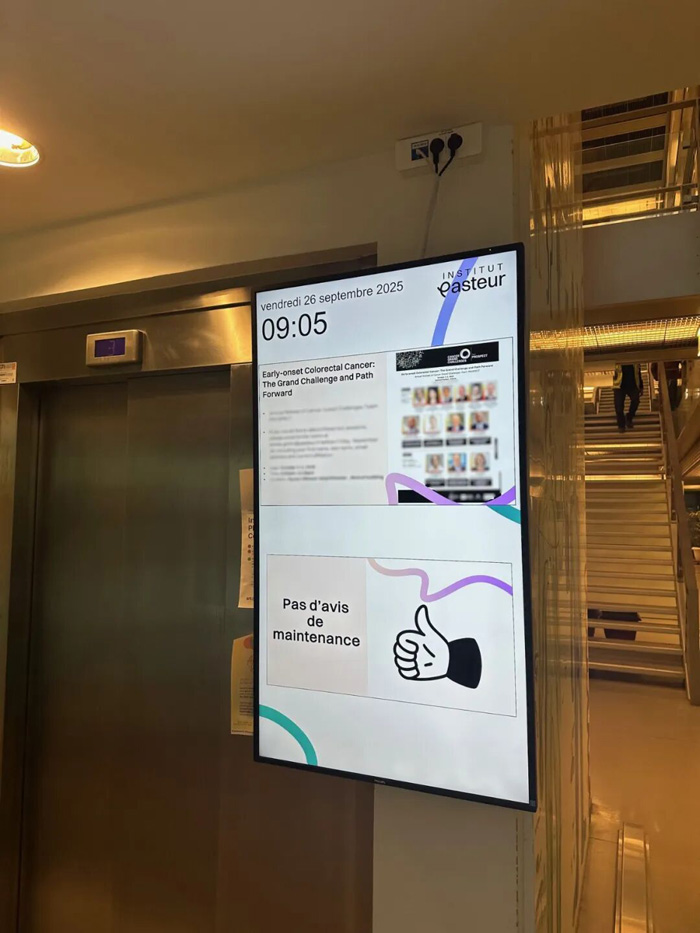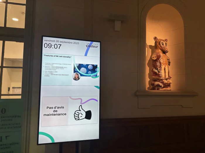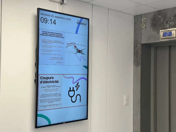 巴斯德研究所在多处静态信息展示区域部署了 Philips Tableaux。这款创新的彩色墨水屏在显示静态图像时完全不消耗电能,仅在画面切换的瞬间产生微弱功耗。