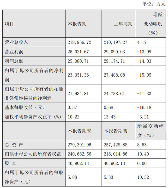 归属于母公司所有者的净利润为 2.34 亿元,较上年同期的 2.75 亿元同比下降 15.05%;归属于母公司所有者的扣除非经常性损益的净利润 2.19 亿元,较上年同期的 2.47 亿元同比下降 11.33%。基本每股收益 0.57 元,较上年同期的 0.68 元同比下降 16.18%;加权平均净资产收益率 10.22%,较上年同期的 13.43% 减少 3.21 个百分点。