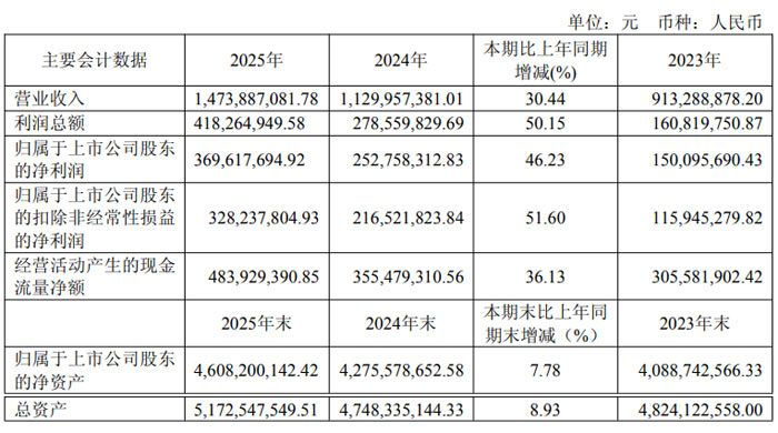 资产规模方面,截至 2025 年末,公司总资产达 51.73 亿元,同比增长 8.93%;归属于上市公司股东的净资产 46.08 亿元,同比增长 7.78%,资产结构稳健。经营活动产生的现金流量净额为 4.84 亿元,同比增长 36.13%,现金流状况良好,为公司持续发展提供坚实支撑。