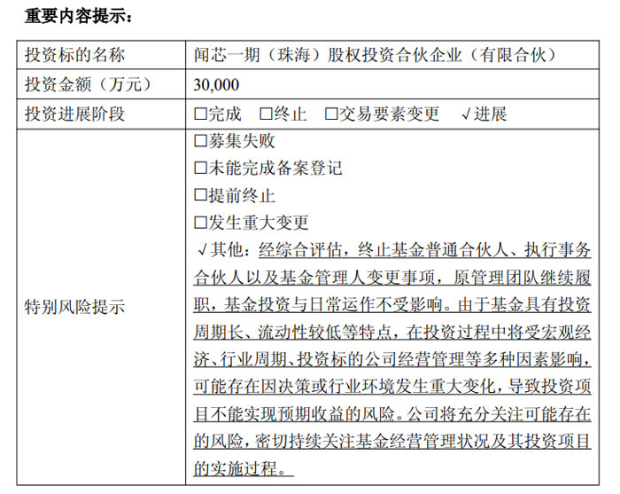 公告显示,闻芯一期此前曾拟将普通合伙人、执行事务合伙人及基金管理人变更为无锡联泰私募基金管理有限公司,相关事项曾于 2025 年 12 月 11 日进行披露。本次经综合评估基金运作现状、管理人变更流程成本、基金业协会备案要求,并充分征询全体合伙人意见后,为保障基金平稳运营、维护投资者利益,闻芯一期审慎决定终止上述变更事项。目前,闻芯一期普通合伙人、执行事务合伙人仍为珠海闻芯投资有限公司,基金管理人为嘉兴厚熙投资管理有限公司。