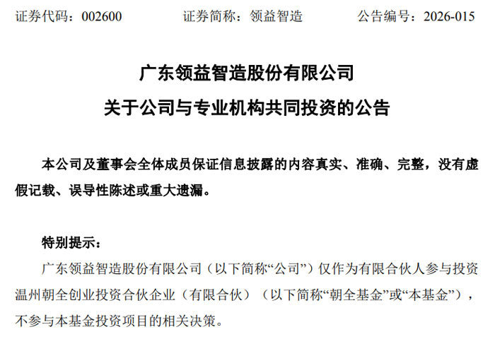 公告显示,朝全基金组织形式为有限合伙企业,存续期限为自基金成立之日起 5 年,全体合伙人均以货币形式出资,出资进度将按照基金管理人发出的缴款通知要求实缴完毕。该基金的核心投资方向为先进装备终端制造企业,不设立投资决策委员会,对外投资项目的筛选、方案制定、日常决策及投后管理等均由基金管理人上海朝希负责,领益智造作为有限合伙人,不参与基金投资项目的相关决策,仅以其认缴出资额为限对基金债务承担有限责任。