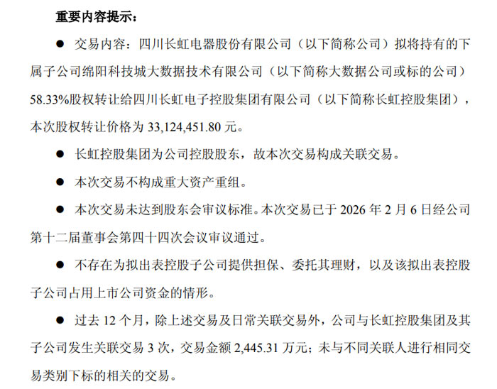 近日,四川长虹电器股份有限公司(证券代码:600839,证券简称:四川长虹)发布公告,披露公司拟将持有的绵阳科技城大数据技术有限公司(下称 “大数据公司”)58.33% 股权转让给控股股东四川长虹电子控股集团有限公司(下称 “长虹控股集团”),本次转让价格为 3312.45 万元,交易构成关联交易,不构成重大资产重组,且无需提交公司股东会审议。