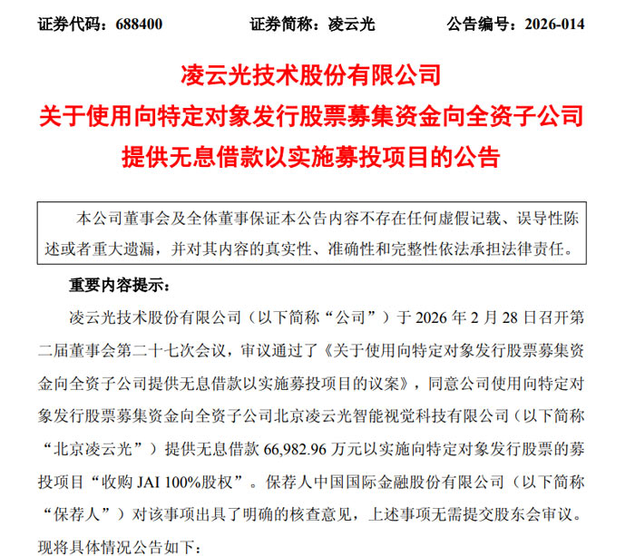 3 月 3 日,凌云光技术股份有限公司(证券代码:688400,证券简称:凌云光)发布两则公告,披露公司完成向特定对象发行股票募集资金的相关使用安排,不仅以募集资金置换预先投入募投项目及支付发行费用的自筹资金,还将以 6.70 亿元募集资金向全资子公司提供无息借款,专项用于收购 JAI 100% 股权项目。