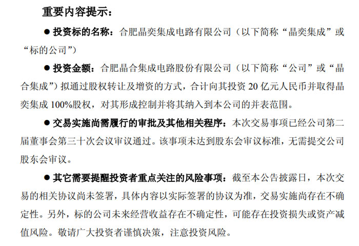 日前,合肥晶合集成电路股份有限公司(证券代码:688249,证券简称:晶合集成)发布公告,宣布拟通过股权转让及增资相结合的方式,合计投资 20.00 亿元取得合肥晶奕集成电路有限公司(下称 “晶奕集成”)100% 股权,交易完成后晶奕集成将成为其全资子公司并纳入合并报表范围。此次交易已获公司第二届董事会第三十次会议审议通过,无需提交股东会审议。