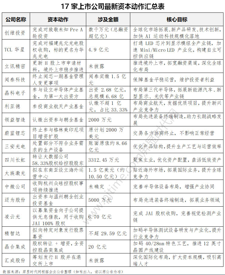资本市场的脉动,往往折射着产业发展的航向。近日,LED、智能终端、智能制造、显示芯片、显示与半导体装备等领域的17家上市公司集中披露最新资本动向,创维投资、TCL 华星、立讯精密、闻泰科技、利亚德、领益智造、三安光电、四川长虹、大族激光、中微公司、晶合集成等行业龙头齐聚,股权投资、股权收购、境外上市、基金布局、资产处置等多元动作同步落地,勾勒出硬科技产业转型升级的清晰路径。