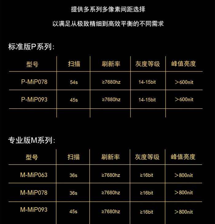 为适配不同场景的性能需求,艾迈谱 Micro-MiP 显示面板系列提供多像素间距选择,精准定义场景性能标准。标准版 P 系列包含 P-MiP078、P-MiP093 两款型号,扫描分别为 54s、45s,刷新率均≥7680hz,灰度等级 14-15bit,峰值亮度 > 600nit,以高性价比满足通用高端显示场景的高效平衡需求;专业版 M 系列则推出 M-MiP063、M-MiP078、M-MiP093 三款型号,扫描为 36s 或 45s,刷新率≥7680hz,灰度等级≥16bit,峰值亮度 > 800nit,以更极致的性能适配指挥中心、虚拟拍摄、高端影院等严苛显示场景。